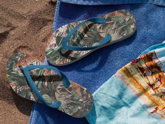 Step out in style in these unique customized flip flops, with printed fabric top side and black soles and straps. S = EU 37-39, M = EU 40-43, L = EU 44-47.