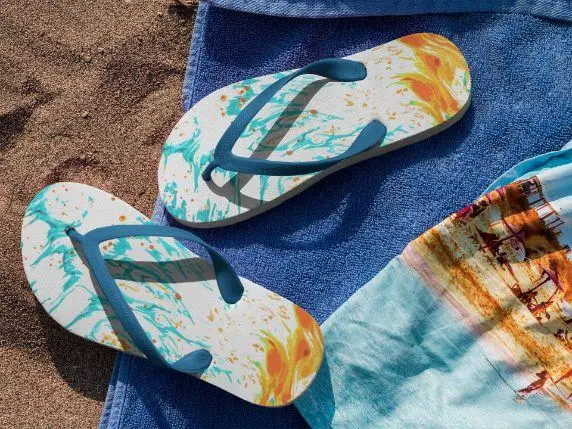 Step out in style in these unique customized flip flops, with printed fabric top side and black soles and straps. S = EU 37-39, M = EU 40-43, L = EU 44-47.