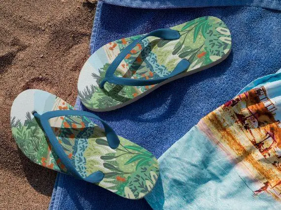 Step out in style in these unique customized flip flops, with printed fabric top side and black soles and straps. S = EU 37-39, M = EU 40-43, L = EU 44-47.