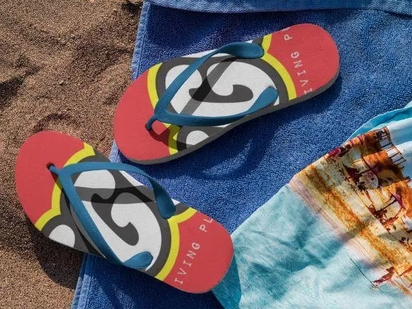 Step out in style in these unique customized flip flops, with printed fabric top side and black soles and straps. S = EU 37-39, M = EU 40-43, L = EU 44-47.
