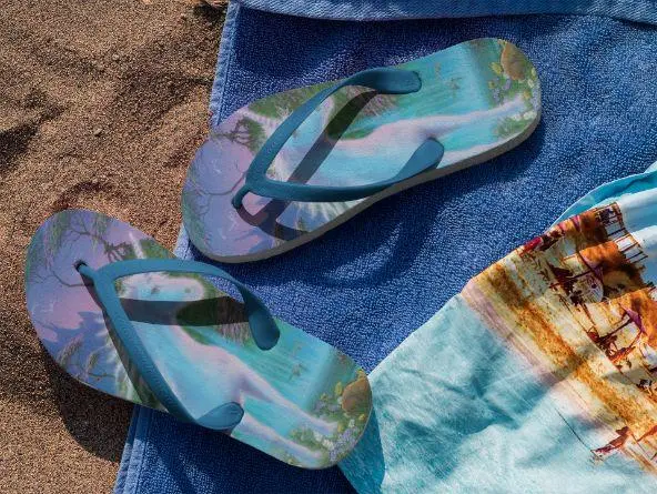 Step out in style in these unique customized flip flops, with printed fabric top side and black soles and straps. S = EU 37-39, M = EU 40-43, L = EU 44-47.
