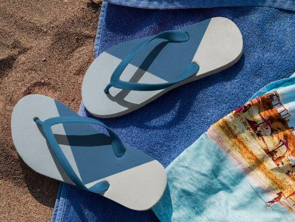Step out in style in these unique customized flip flops, with printed fabric top side and black soles and straps. S = EU 37-39, M = EU 40-43, L = EU 44-47.