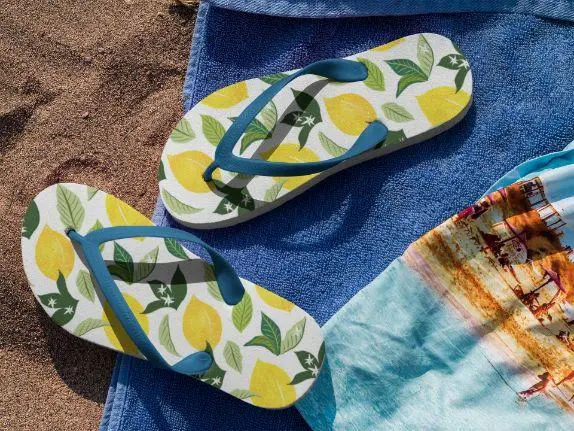 Step out in style in these unique customized flip flops, with printed fabric top side and black soles and straps. S = EU 37-39, M = EU 40-43, L = EU 44-47.