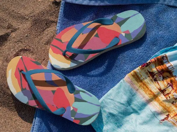Step out in style in these unique customized flip flops, with printed fabric top side and black soles and straps. S = EU 37-39, M = EU 40-43, L = EU 44-47.