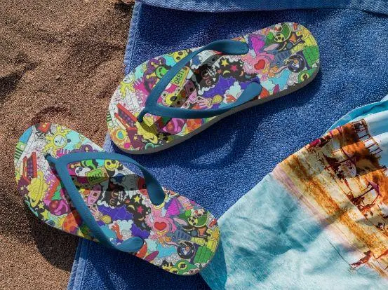 Step out in style in these unique customized flip flops, with printed fabric top side and black soles and straps. S = EU 37-39, M = EU 40-43, L = EU 44-47.