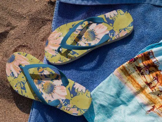 Step out in style in these unique customized flip flops, with printed fabric top side and black soles and straps. S = EU 37-39, M = EU 40-43, L = EU 44-47.