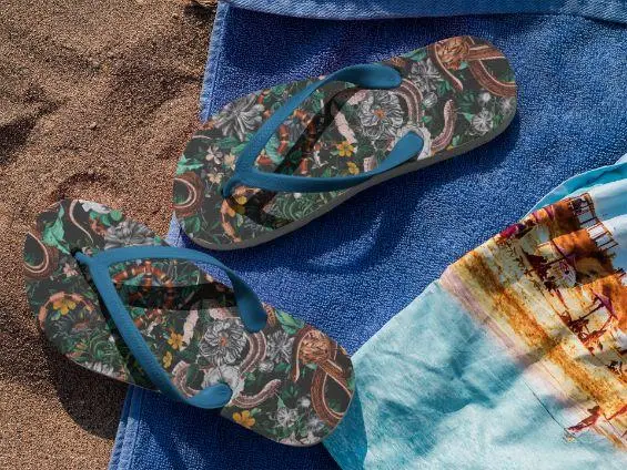 Step out in style in these unique customized flip flops, with printed fabric top side and black soles and straps. S = EU 37-39, M = EU 40-43, L = EU 44-47.