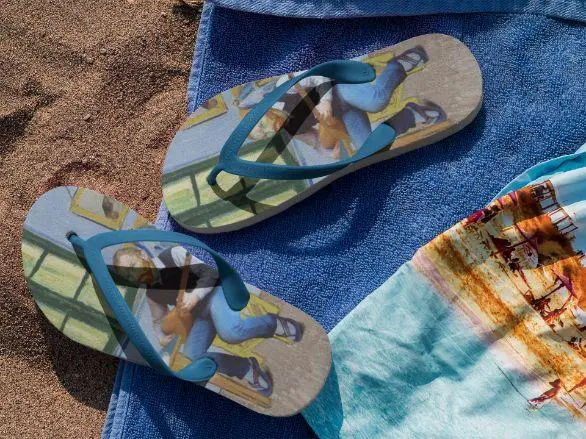Step out in style in these unique customized flip flops, with printed fabric top side and black soles and straps. S = EU 37-39, M = EU 40-43, L = EU 44-47.