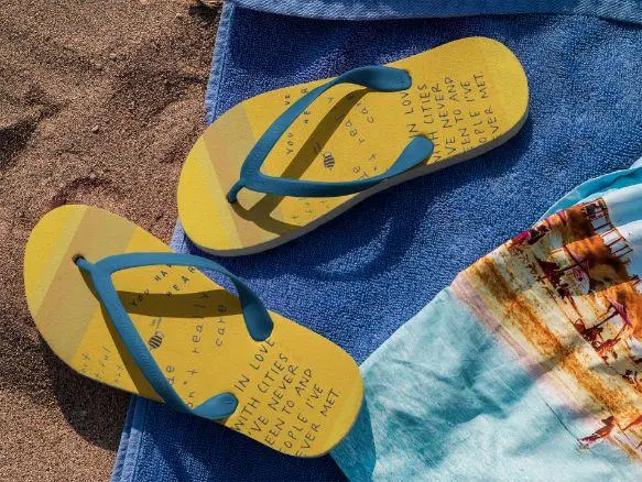 Step out in style in these unique customized flip flops, with printed fabric top side and black soles and straps. S = EU 37-39, M = EU 40-43, L = EU 44-47.