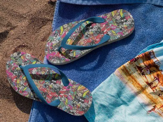 Step out in style in these unique customized flip flops, with printed fabric top side and black soles and straps. S = EU 37-39, M = EU 40-43, L = EU 44-47.