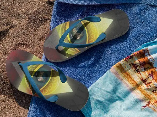 Step out in style in these unique customized flip flops, with printed fabric top side and black soles and straps. S = EU 37-39, M = EU 40-43, L = EU 44-47.