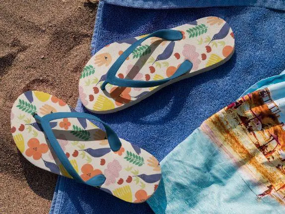 Step out in style in these unique customized flip flops, with printed fabric top side and black soles and straps. S = EU 37-39, M = EU 40-43, L = EU 44-47.
