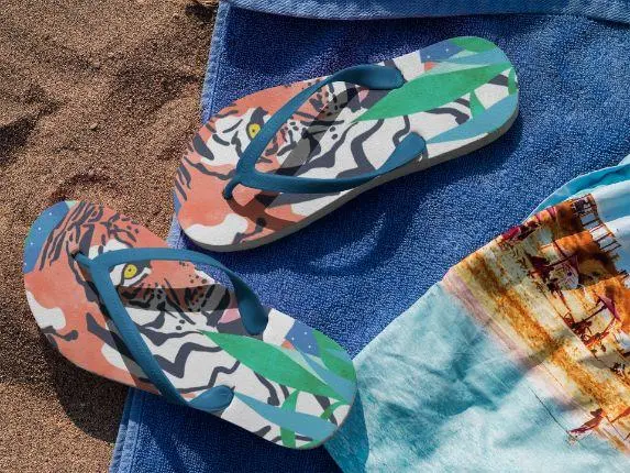 Step out in style in these unique customized flip flops, with printed fabric top side and black soles and straps. S = EU 37-39, M = EU 40-43, L = EU 44-47.