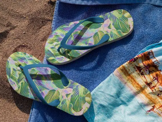 Step out in style in these unique customized flip flops, with printed fabric top side and black soles and straps. S = EU 37-39, M = EU 40-43, L = EU 44-47.