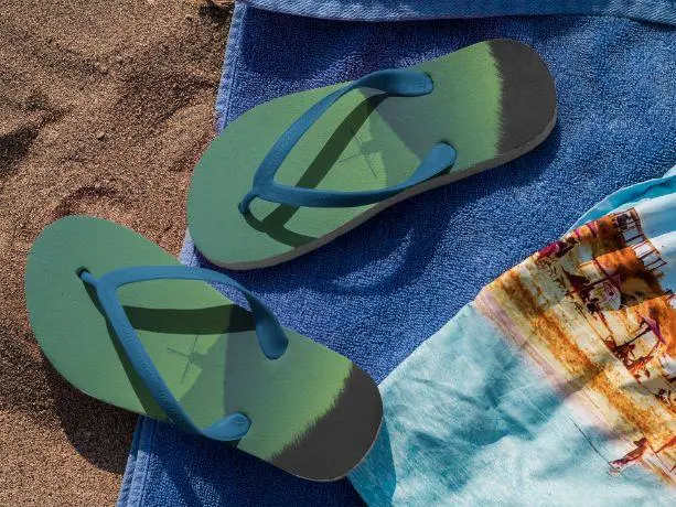 Step out in style in these unique customized flip flops, with printed fabric top side and black soles and straps. S = EU 37-39, M = EU 40-43, L = EU 44-47.