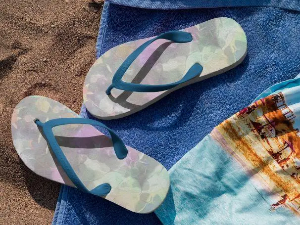 Step out in style in these unique customized flip flops, with printed fabric top side and black soles and straps. S = EU 37-39, M = EU 40-43, L = EU 44-47.