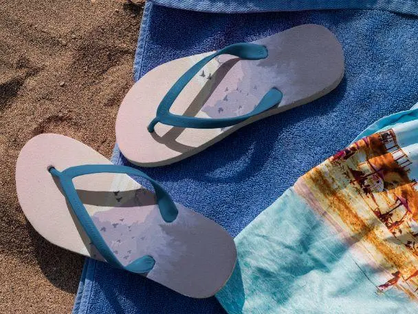 Step out in style in these unique customized flip flops, with printed fabric top side and black soles and straps. S = EU 37-39, M = EU 40-43, L = EU 44-47.