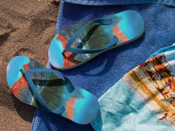 Step out in style in these unique customized flip flops, with printed fabric top side and black soles and straps. S = EU 37-39, M = EU 40-43, L = EU 44-47.