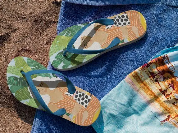 Step out in style in these unique customized flip flops, with printed fabric top side and black soles and straps. S = EU 37-39, M = EU 40-43, L = EU 44-47.