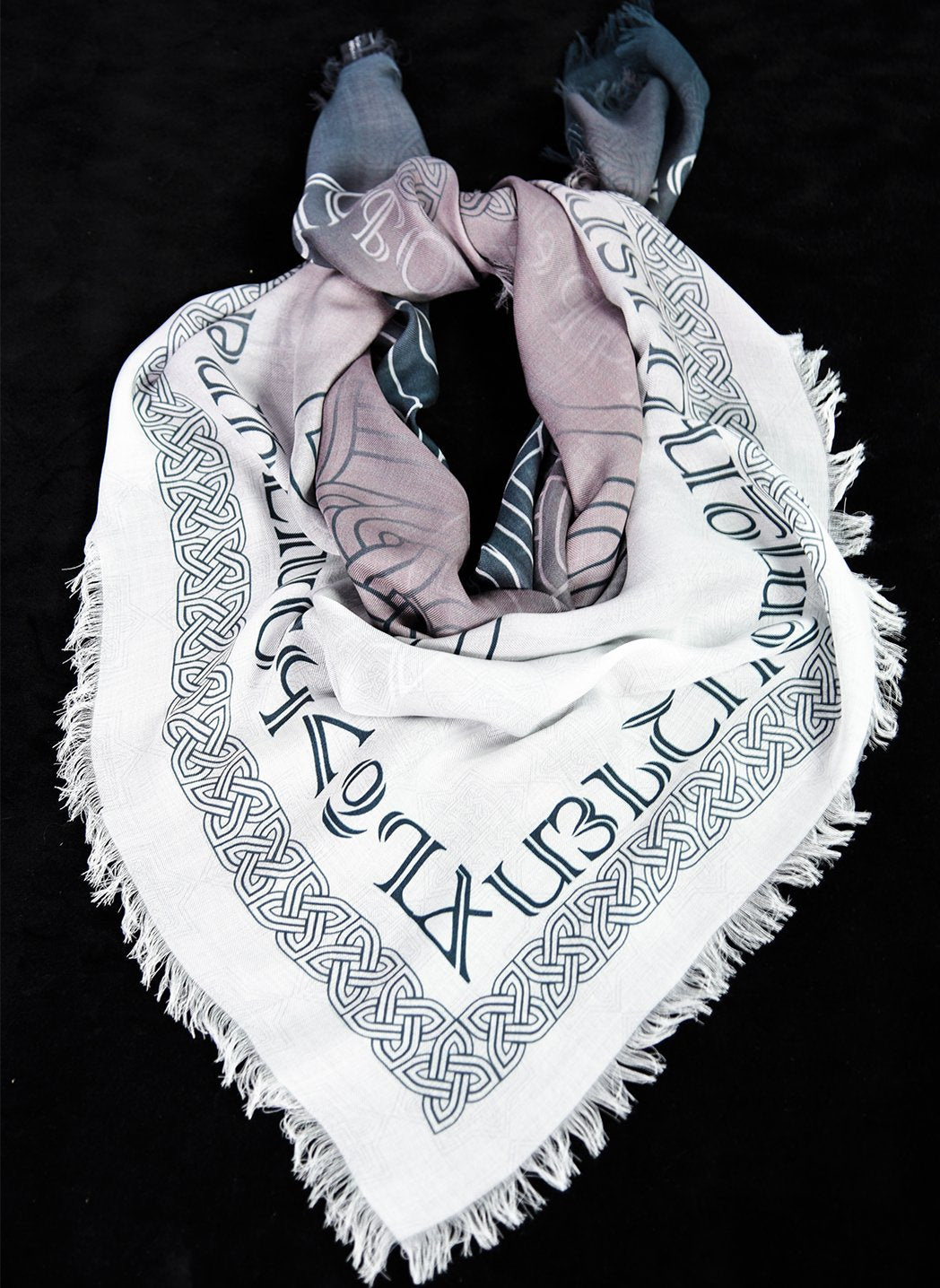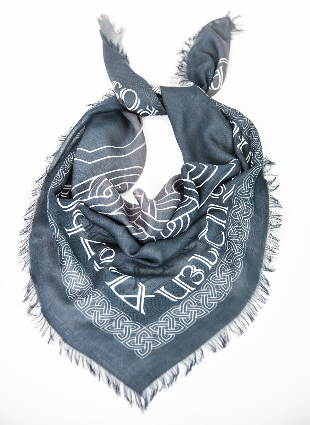 The Armenian Alphabet and Eternity scarf is Modal square scarf with ornamental Armenian design with Black, white and shades of Grey. There is 1 inch fringe on all for side of the scarf. The scarf is embedded with elements of ancient Armenian architecture and calligraphy.