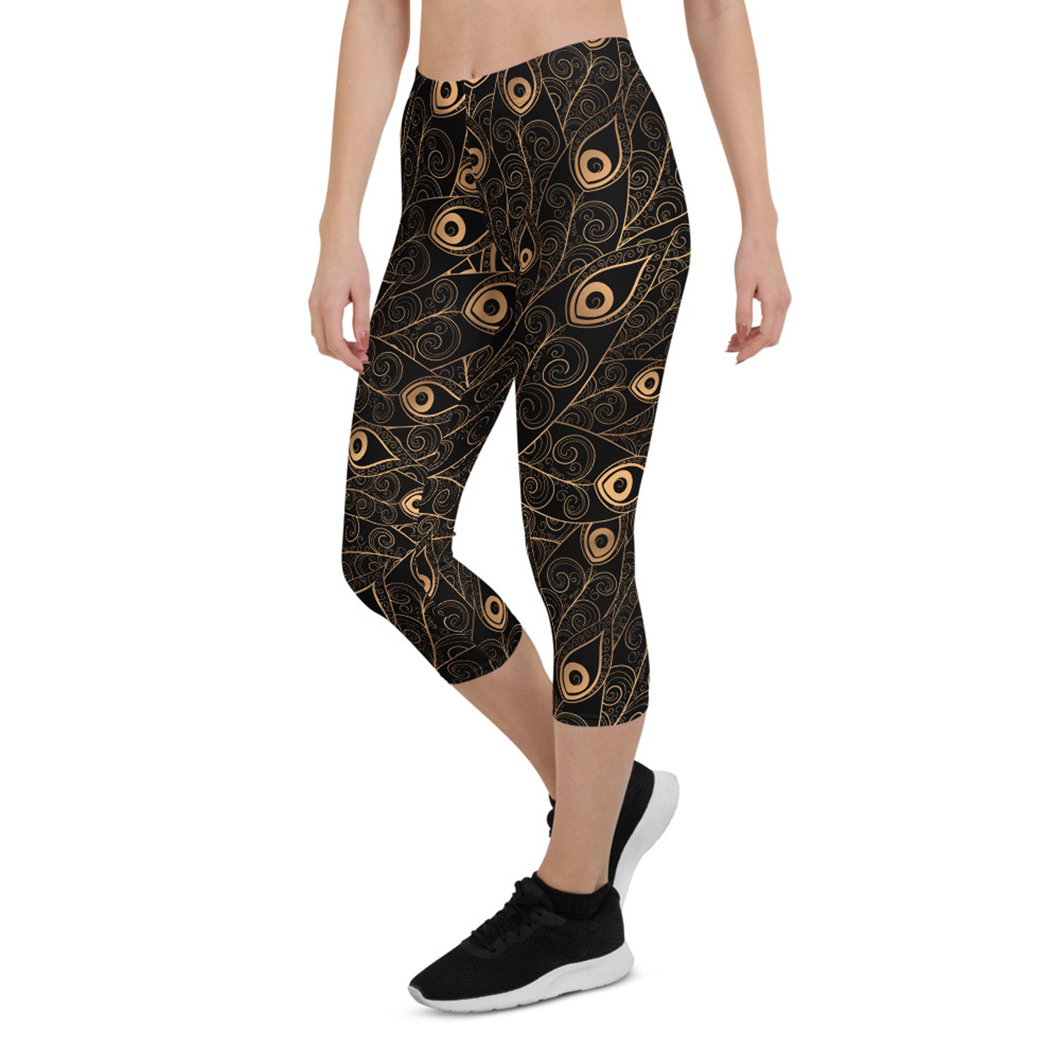Art Deco Peacock Feather Black Capri Leggings