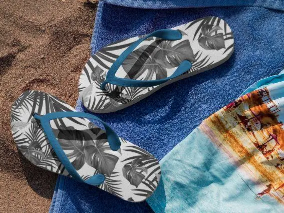 Step out in style in these unique customized flip flops, with printed fabric top side and black soles and straps. S = EU 37-39, M = EU 40-43, L = EU 44-47.