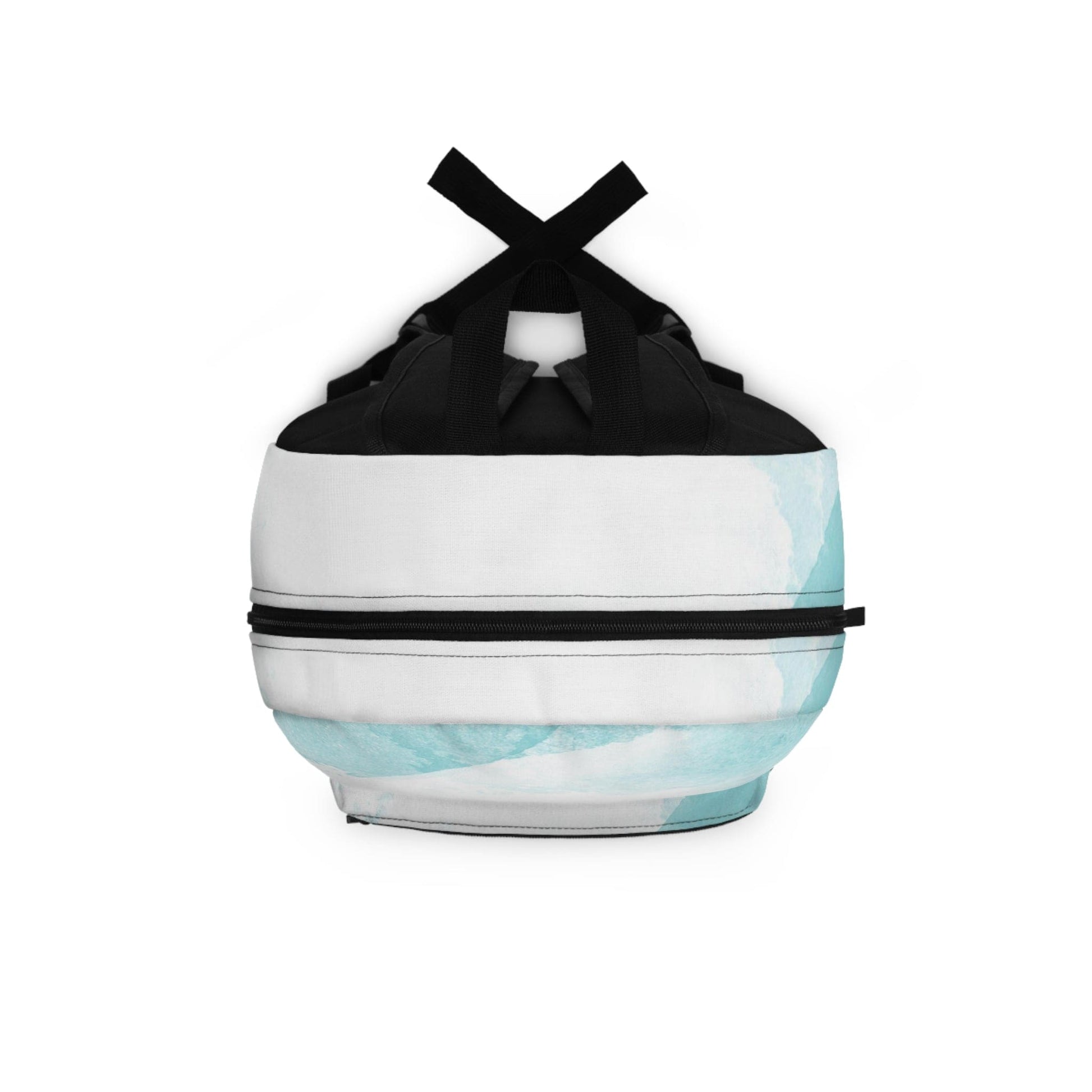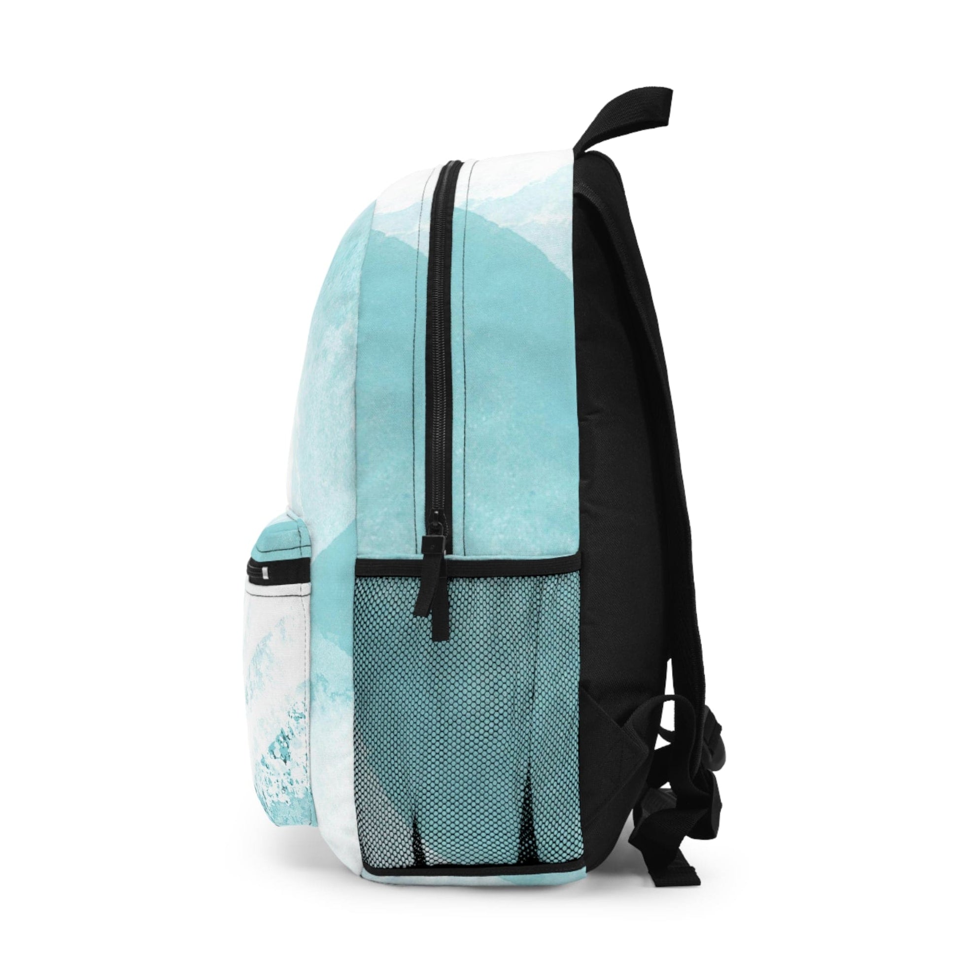 Backpack - Large Water-Resistant Bag, Subtle Abstract Ocean Blue And White Print. Have you got room for all that? With our roomy and durable backpack, you will! This bag is made from spun polyester and weights 1.3 lbs, just enough to be light, strong and long-lasting. Grab it, stow it, throw it onto the seat next to you, this backpack can take it, and so will you, wherever you go!