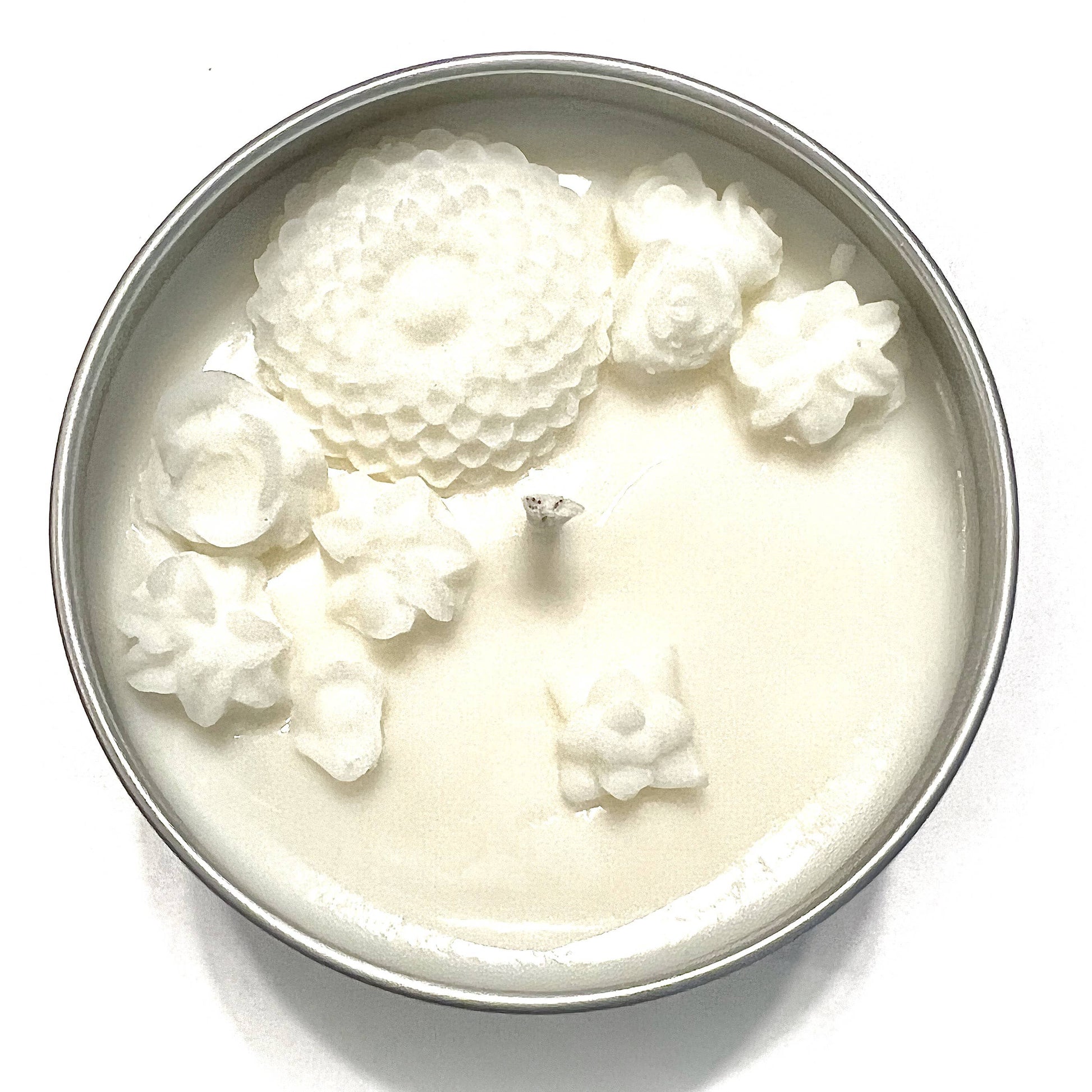 Sweet and dreamy coconut milk meets bright and ripe mango for this Thai Tea inspired soy candle: delicate floral wax melts top the creamy white wax. Made with phthalate free fragrance and lead free cotton wick. Labeled tins come in 2, 4 and 8 oz. sizes. 2 oz tins measure 2.05 inches wide, 1.38 inches tall. 4 oz. tins measure 2.4 inches wide and 1.8 inches tall. 8 oz. tins measure 3.2 inches wide and 2 inches tall. Trim wick to 1/8 to 1/4 inch, never burn unattended, near drafts or in reach of children or pets.