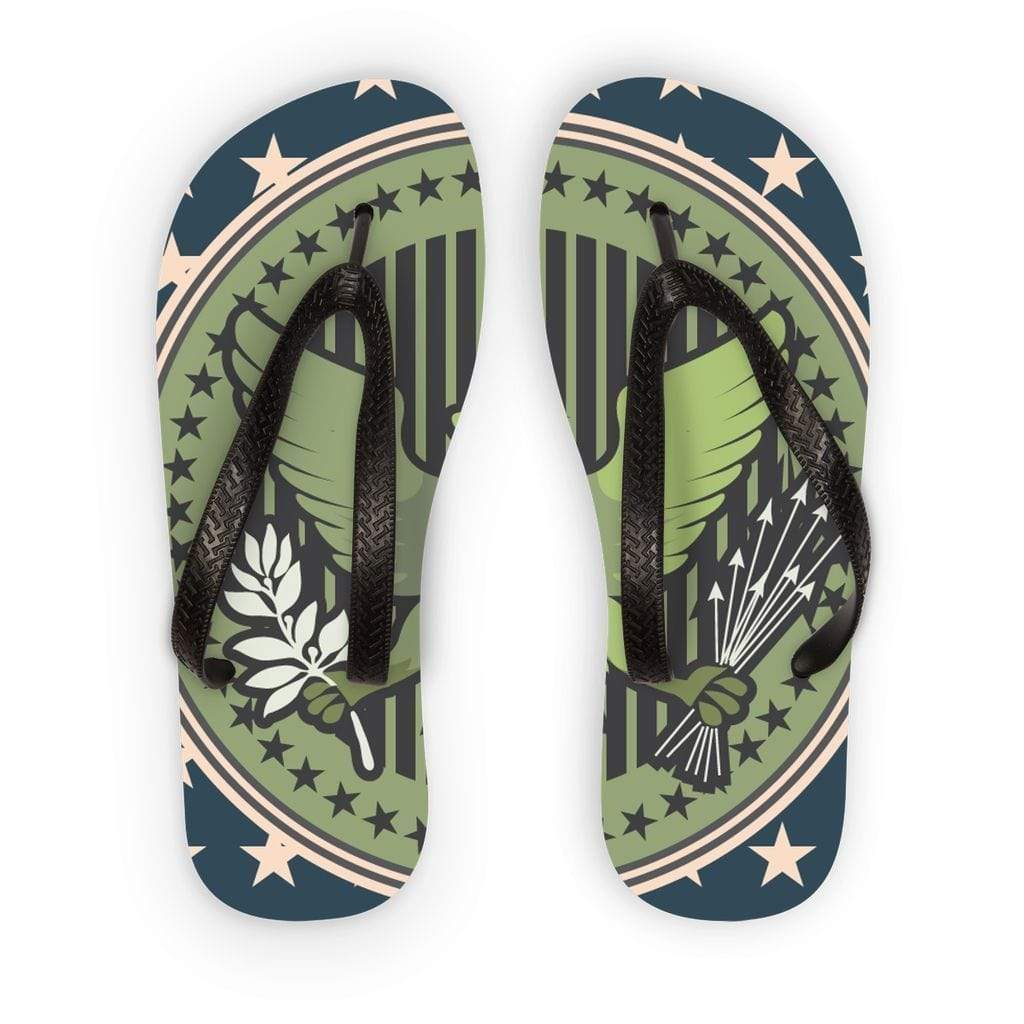Step out in style in these unique customized flip flops, with printed fabric top side and black soles and straps. S = EU 37-39, M = EU 40-43, L = EU 44-47.