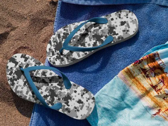 Step out in style in these unique customized flip flops, with printed fabric top side and black soles and straps. S = EU 37-39, M = EU 40-43, L = EU 44-47.