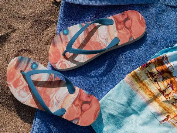 Step out in style in these unique customized flip flops, with printed fabric top side and black soles and straps. S = EU 37-39, M = EU 40-43, L = EU 44-47.