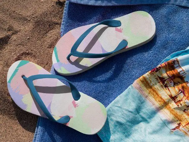 Step out in style in these unique customized flip flops, with printed fabric top side and black soles and straps. S = EU 37-39, M = EU 40-43, L = EU 44-47.