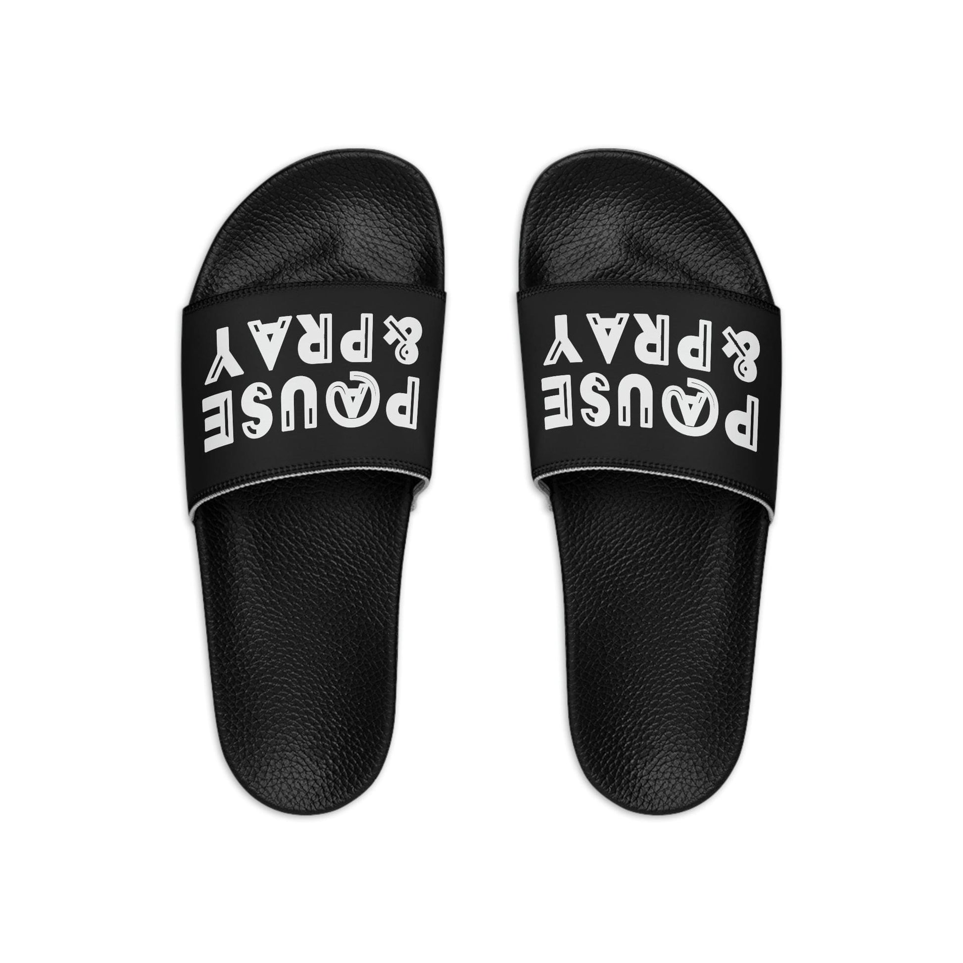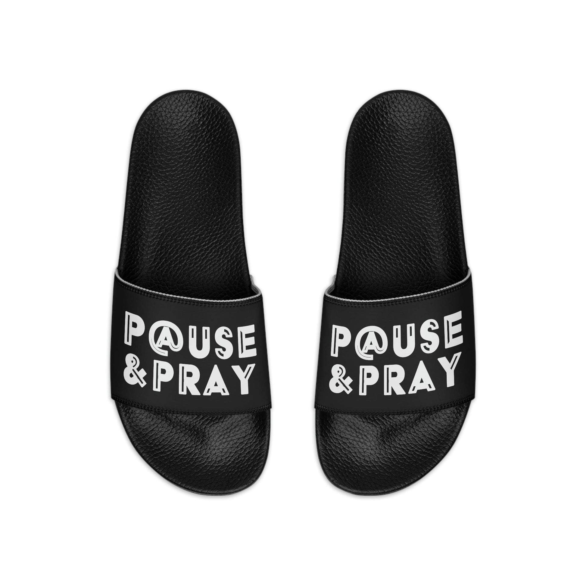Mens Black Slide Sandals - Pause and Pray - Christian Inspiration