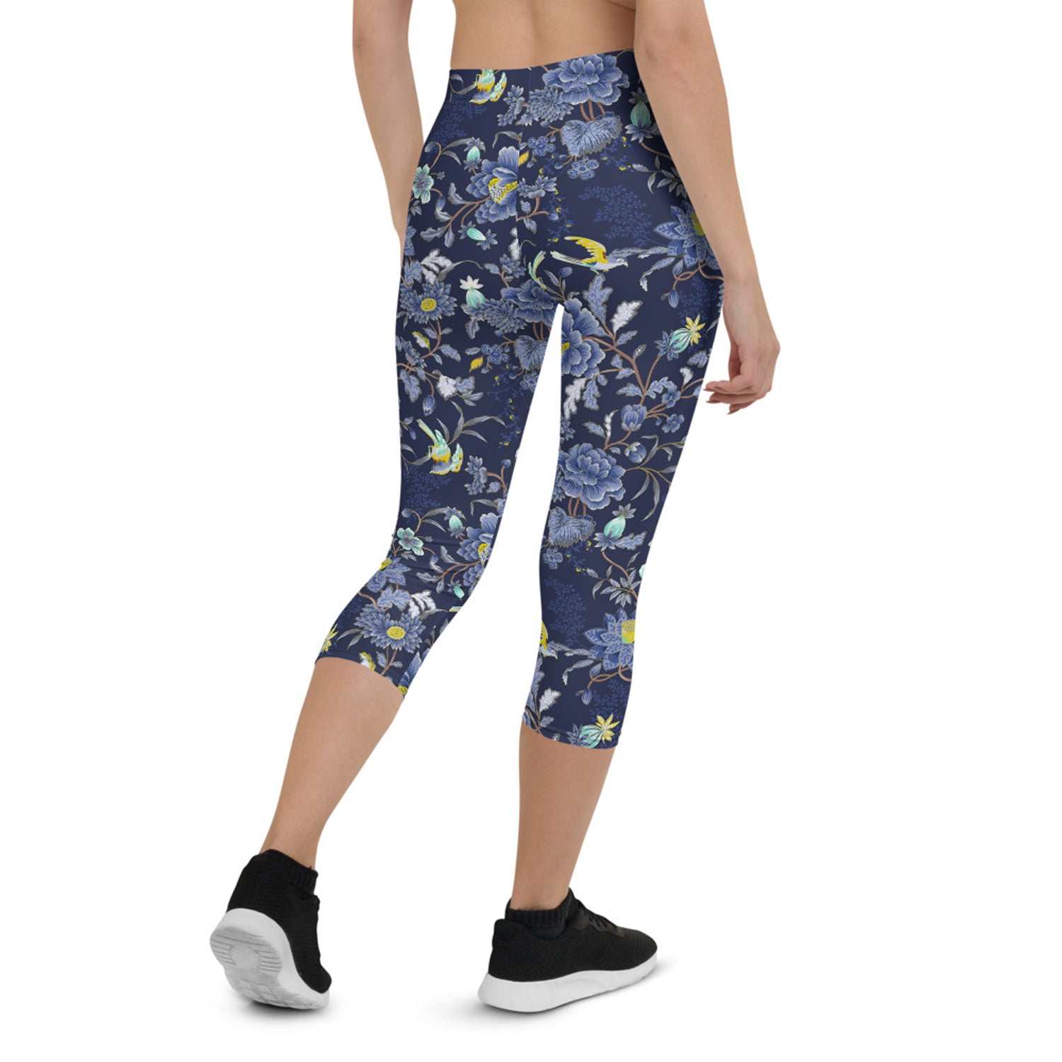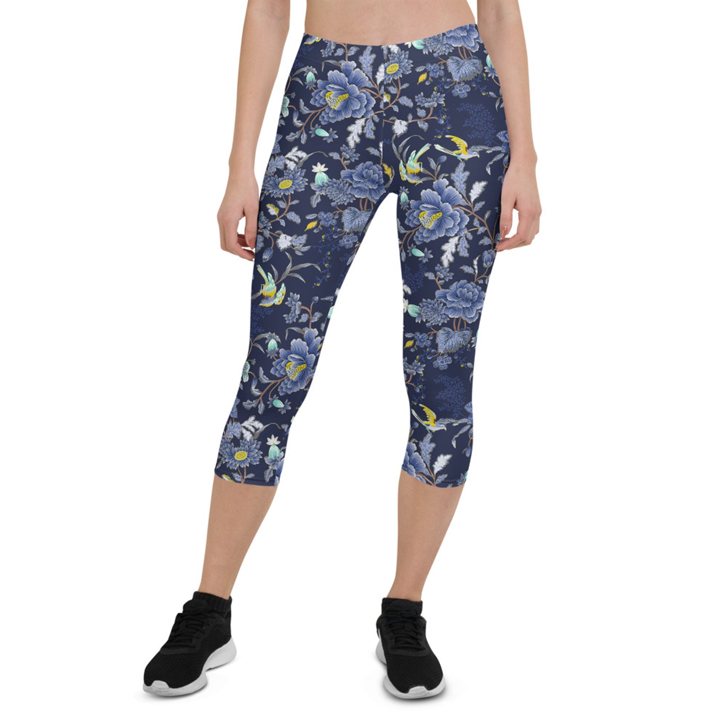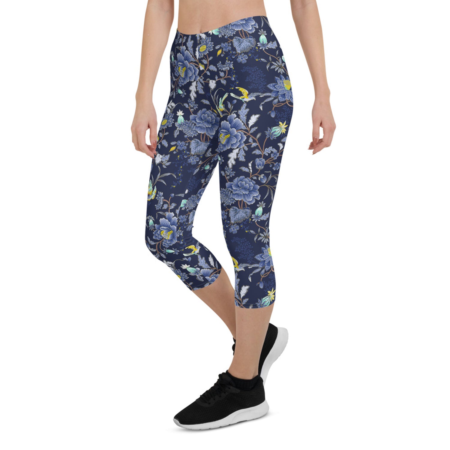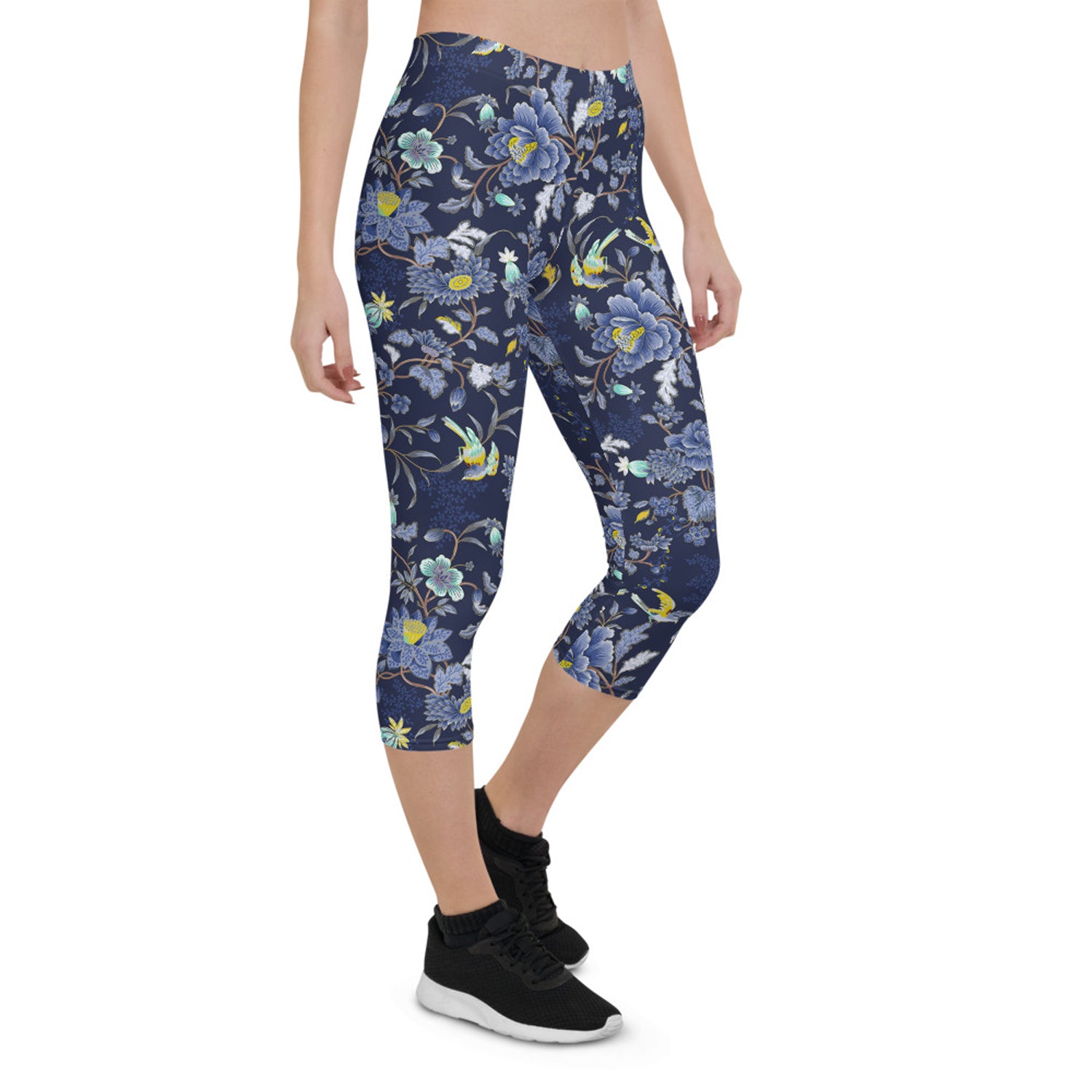 Oriental Floral Capri Leggings on Navy Blue