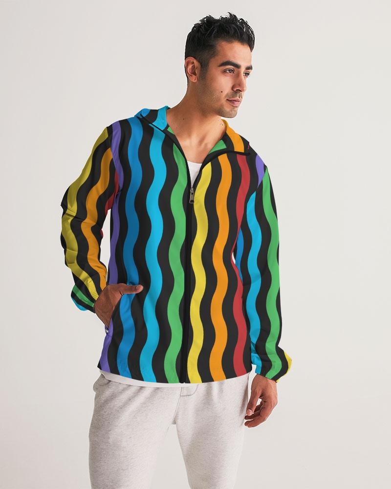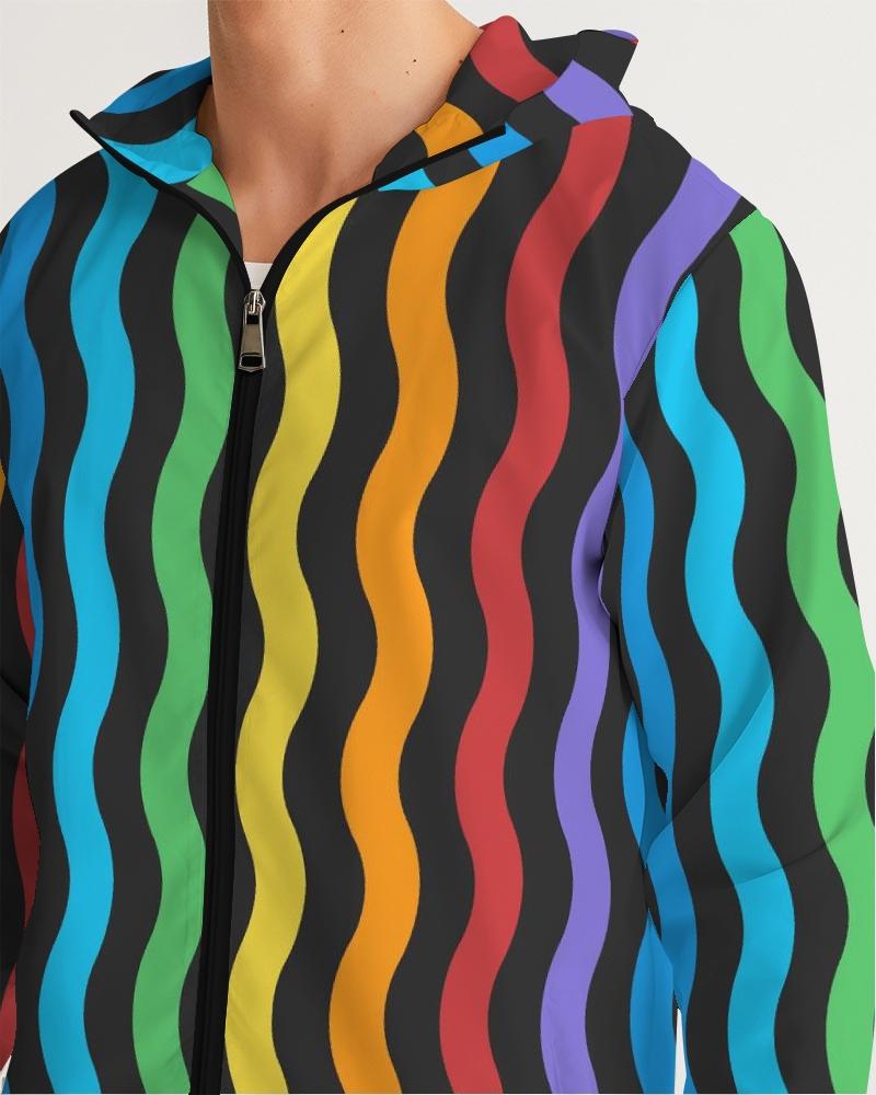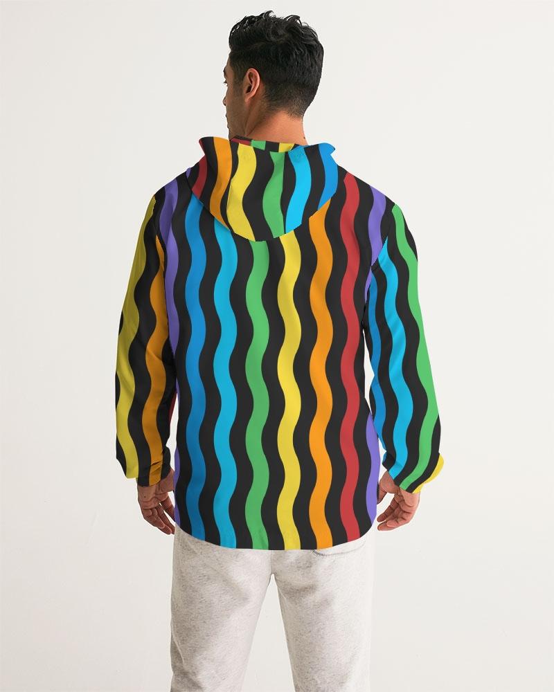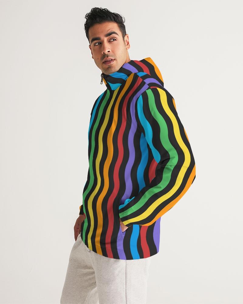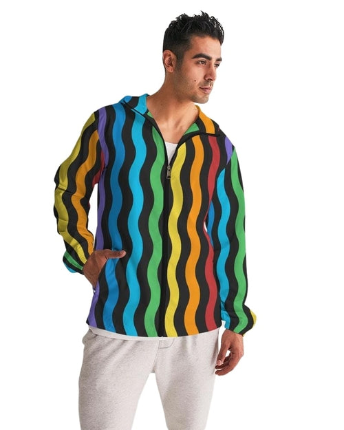 Mens Hooded Windbreaker - Rainbow Striped Water Resistant Jacket -