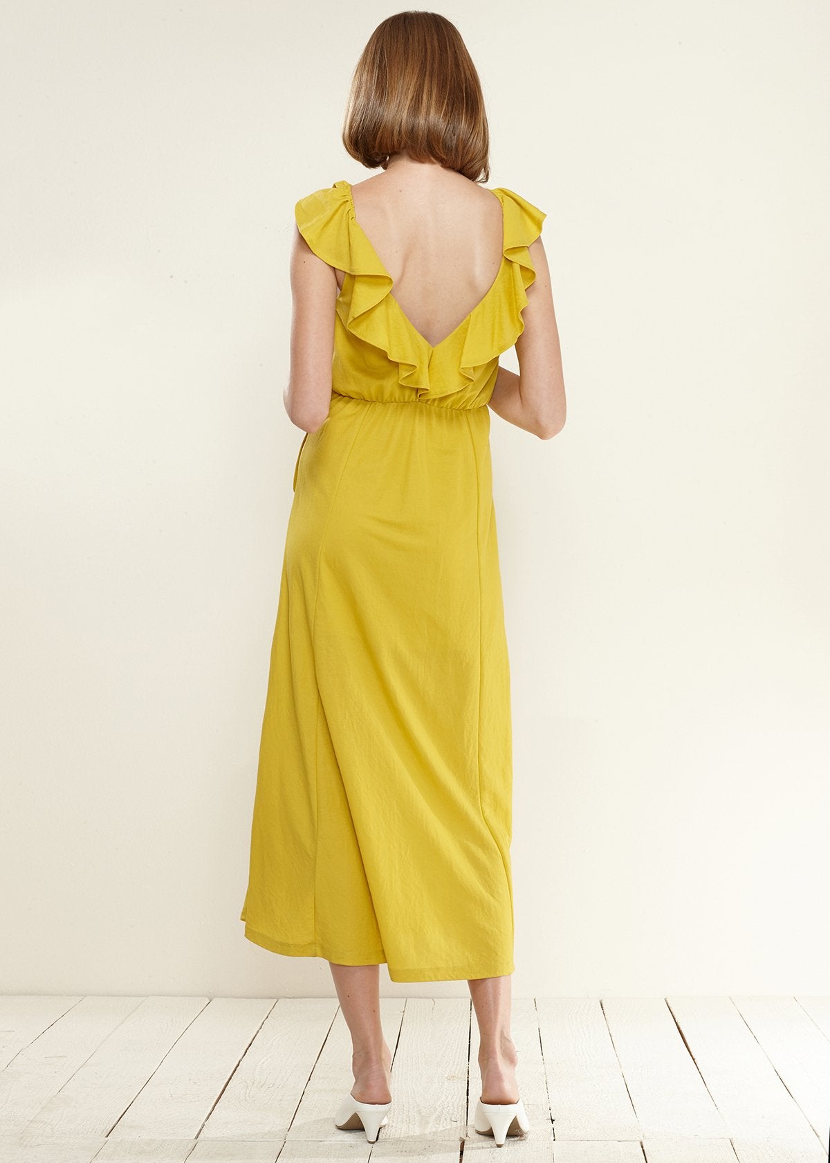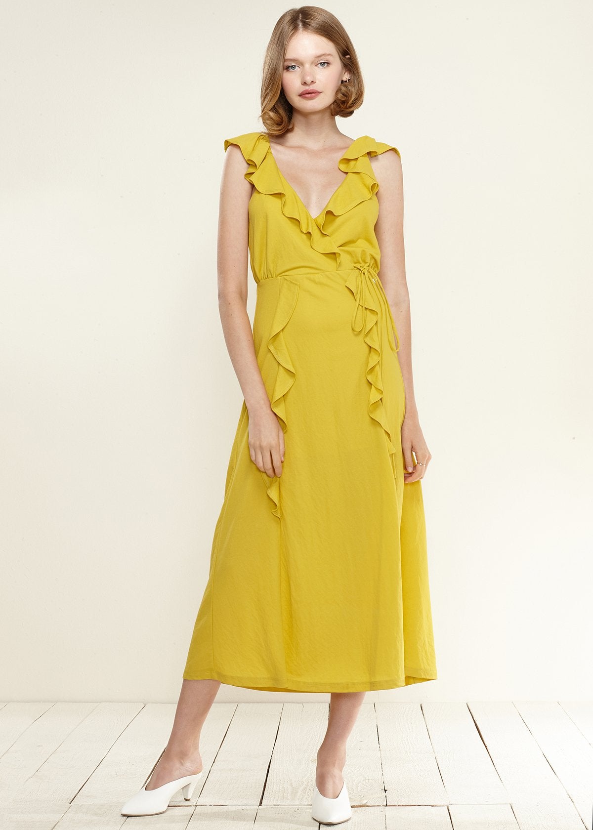 Women's Ruffle Trim Wrapped Maxi Dress in Mustard