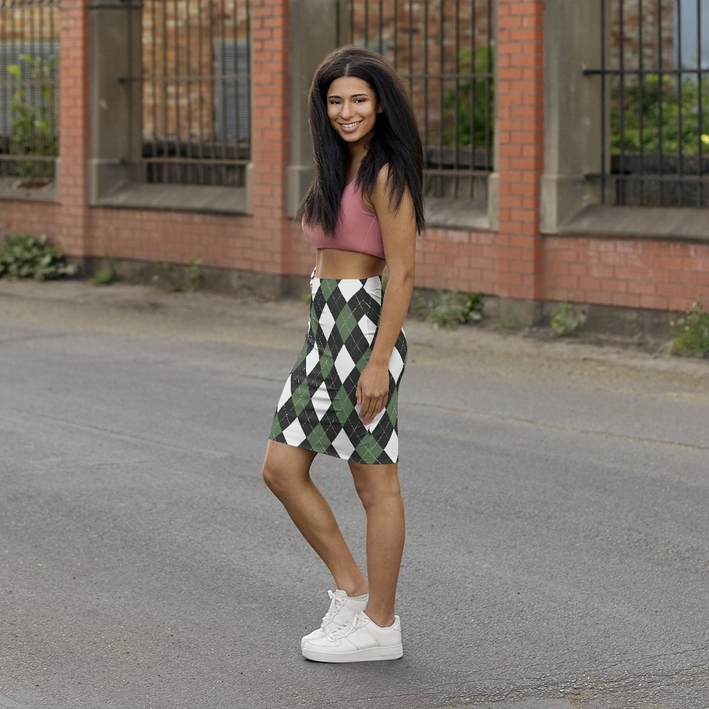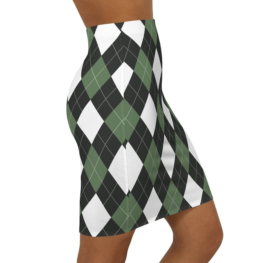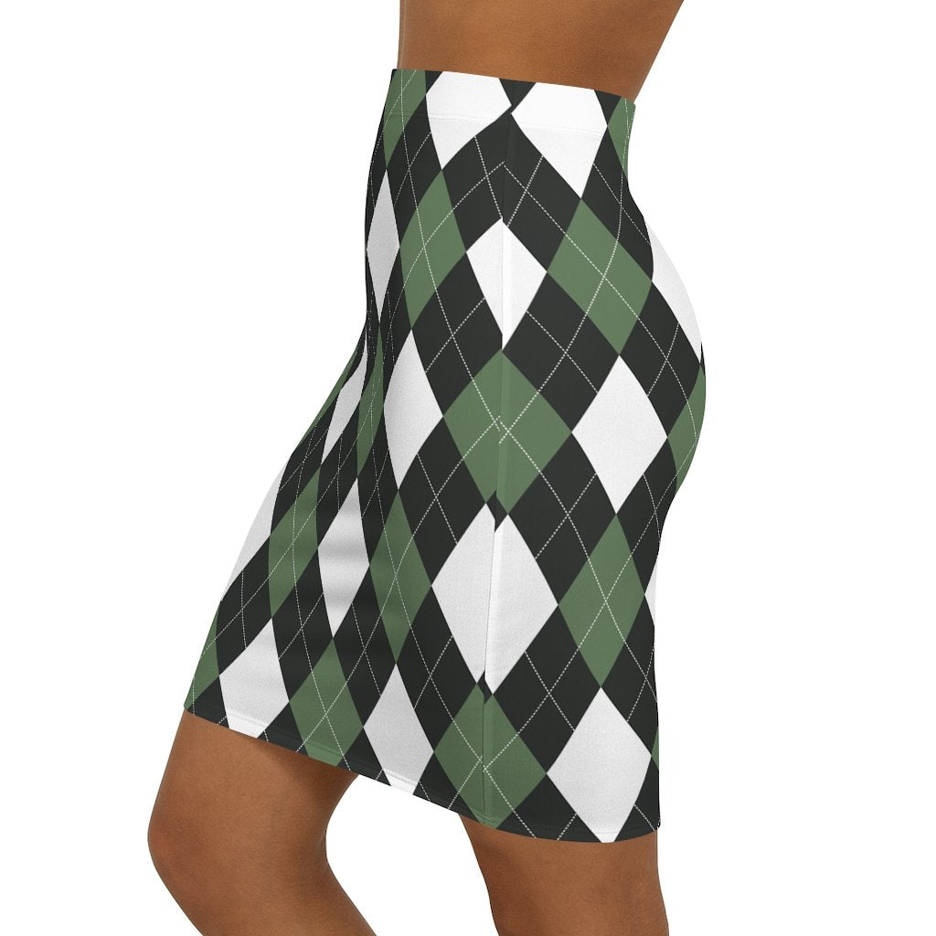 Womens Pencil Skirt - Green and White Argyle Stretch Mini