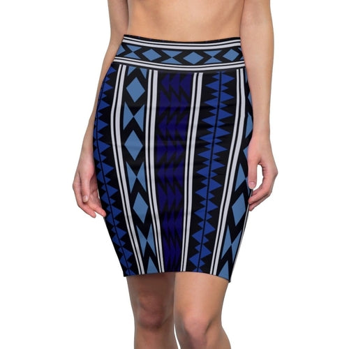 Womens Pencil Skirt - High Waist Stretch - Blue Aztec