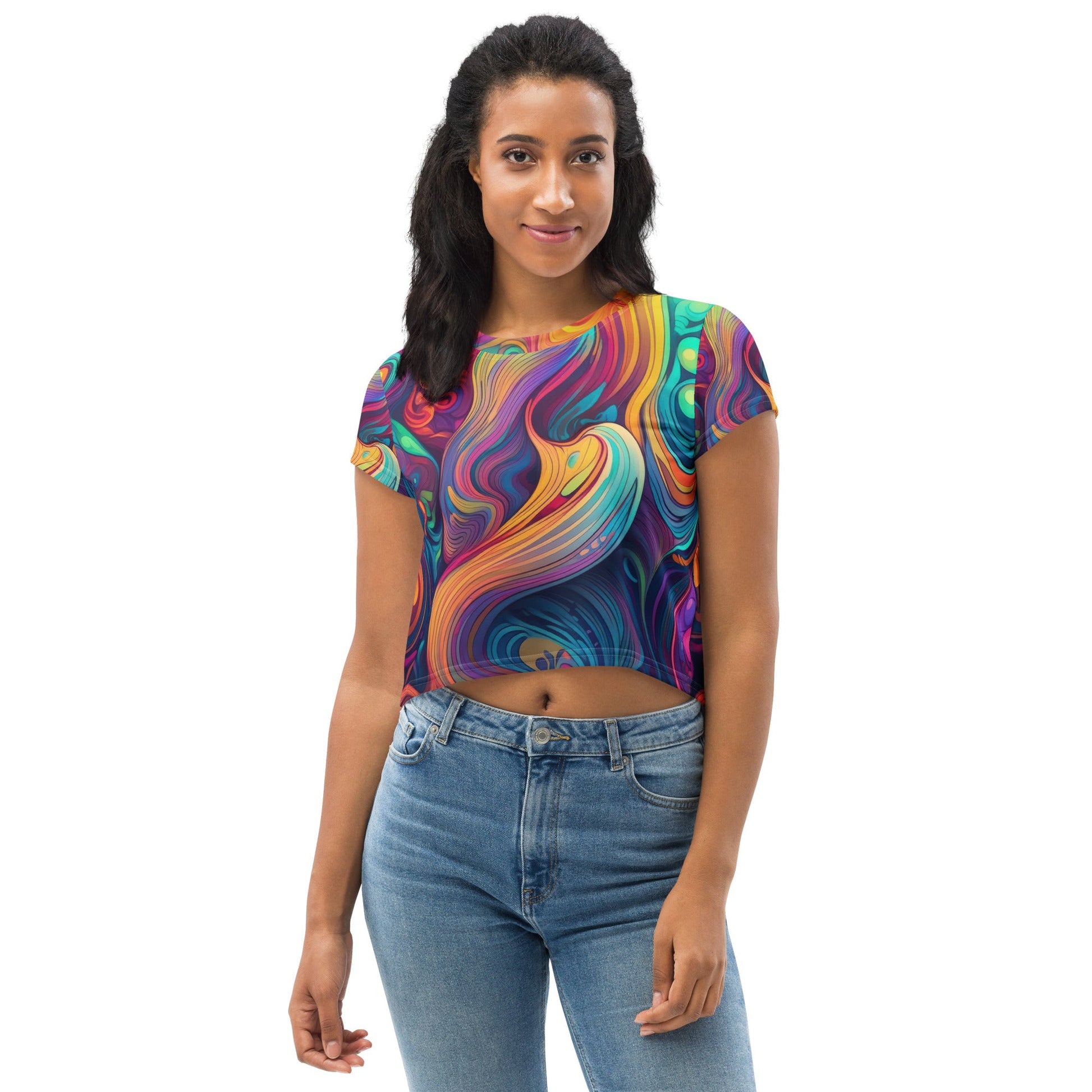 Womens Stretch Fit Crop Tee, Vibrant Psychedelic Rave Pattern -Kaleidoscope Funky Boho Festive Design 898642. Our women's crop tee jersey offers a delightful blend of comfort and style, perfect for any casual occasion. Crafted from soft, breathable fabric, this chic top features a cropped silhouette that pairs effortlessly with high-waisted bottoms for a trendy look. The crew neckline and short sleeves enhance its laid-back appeal, making it an ideal choice for workouts, outings, or lounging at home. This versatile piece is a must-have addition to your wardrobe, ensuring you stay fashionable and comfortable all day long.