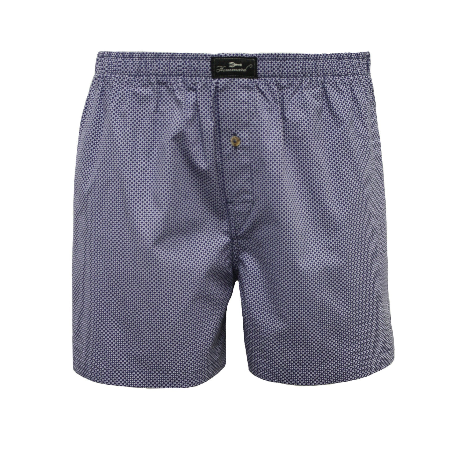 Classic cotton boxer shorts woven in comfort fit with a fly opening, closed with a real shell button. With a soft elasticized waistband, side slits at the side seam for more comfort, made of Fine woven pure cotton, Hommard logo on waistband.