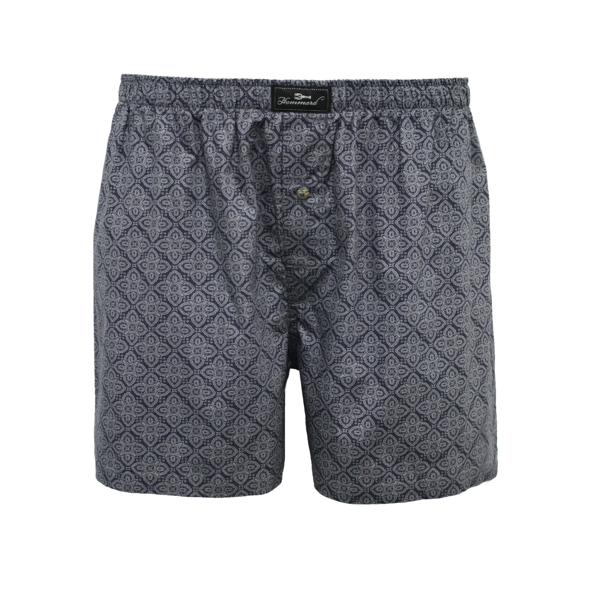 Classic cotton boxer shorts woven in comfort fit with a fly opening, closed with a real shell button. With a soft elasticized waistband, side slits at the side seam for more comfort, made of Fine woven pure cotton, Hommard logo on waistband.